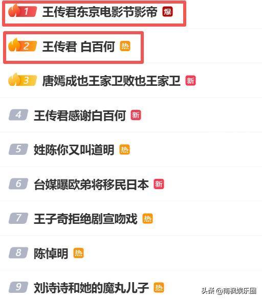 当下,“王传君东京电影节影帝”、“王传君、白百何”两个词条直接顶上热搜前二。